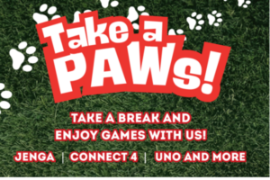 Come de-stress at our Take a PAWs event! We will have board games, bracelet-making, lawn games like cornhole, and more!